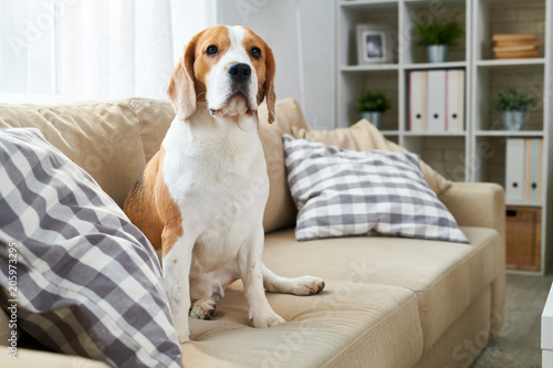 Portrait Of Mature Purebred Beagle Dog Sitting On Couch In Modern Apartment And Looking At Camera Copy Space Buy This Stock Photo And Explore Similar Images At Adobe Stock Adobe Stock