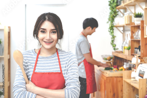 Attractive Young Asian Couple Wearing Casual Orange Apron Cooking Meal In Wooden Kitchen At Home Or Apartment Young Asian Student Man And Woman Healthy Lifestyle With Clean Food Soft Tone Concept