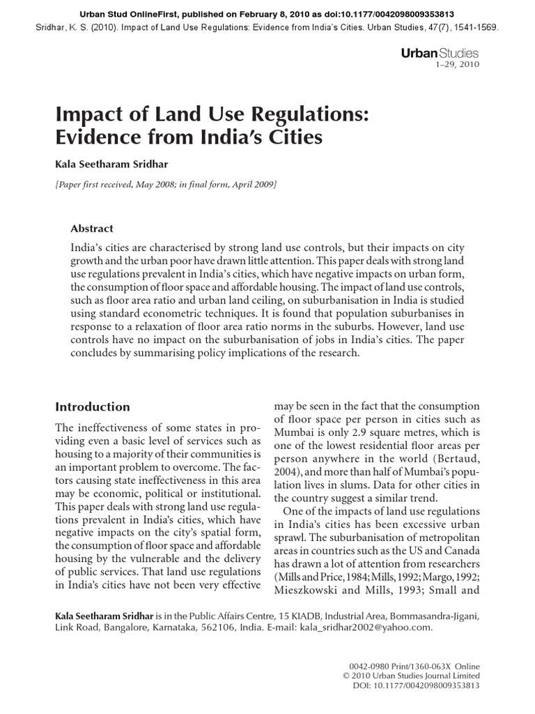 Sridhar K S 2010 Impact Of Land Use Regulations Evidence From India S Cities Urbs Urban Sprawl Census
